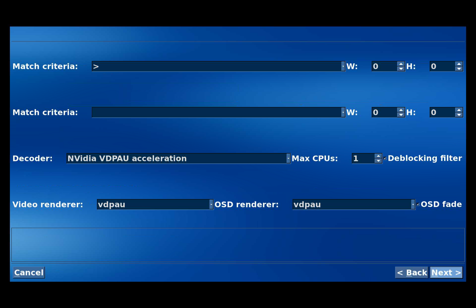 cmp(> 0 0) dec(vdpau) cpus(1) skiploop(enabled) rend(vdpau) osd(vdpau)